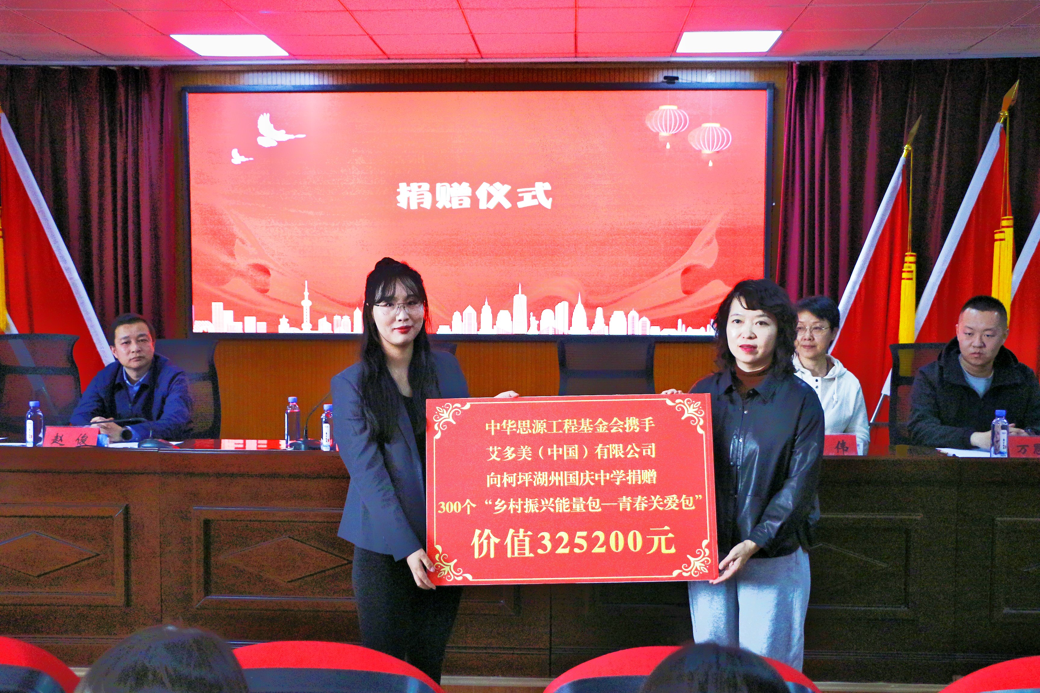 捐赠仪式上,中华思源工程基金会携手艾多美(中国)有限公司向柯枰湖州国庆中学捐赠价值32.52万元的“乡村振兴能量包