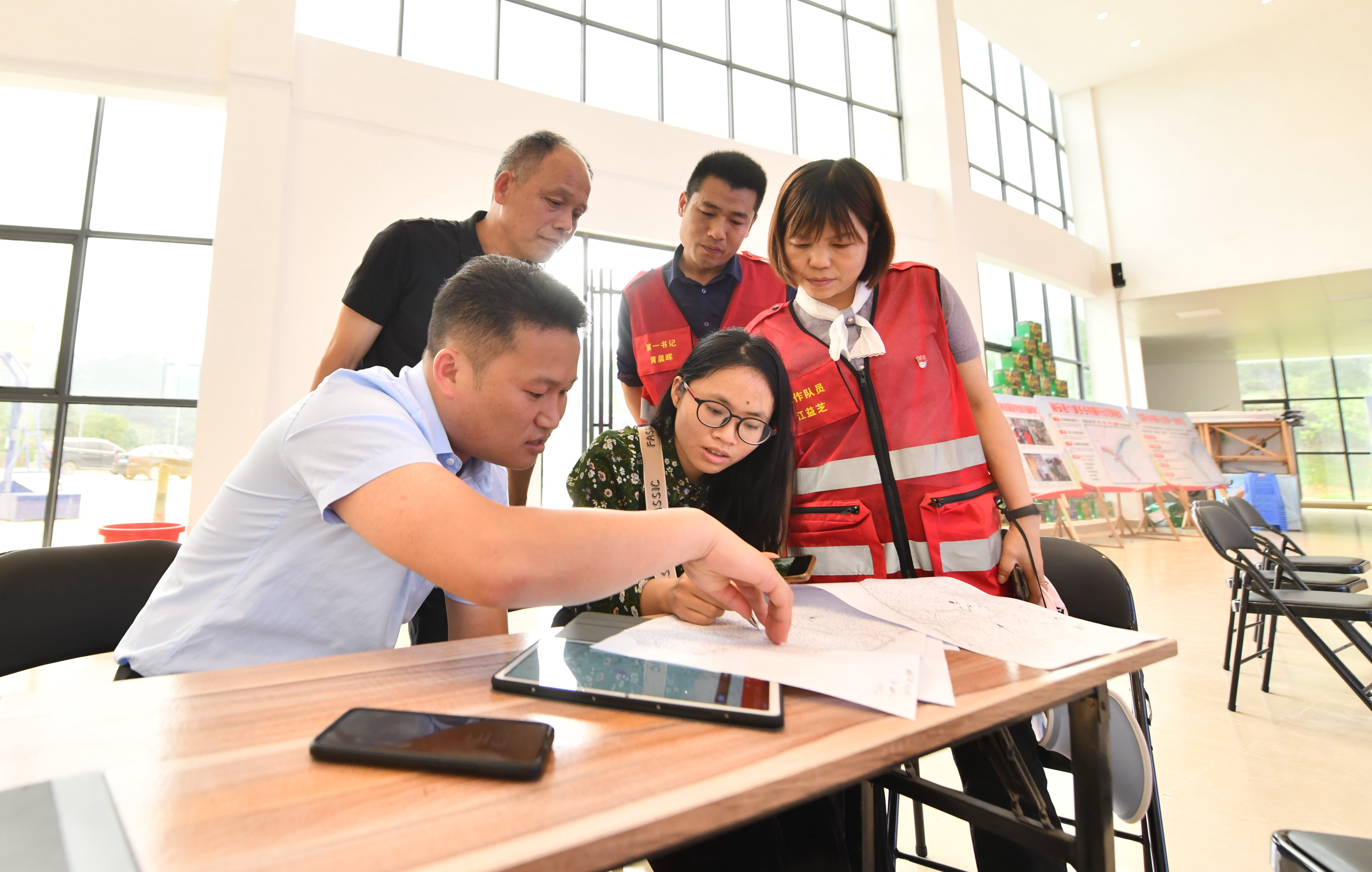 2022年5月6日,广西柳州市融安县大坡乡岗伟村驻村第一书记黄晨晖(后排右)和乡镇干部、工程设计人员在大坡飞鸡农特产品大数据中心讨论岗伟村产业示范带方案。新华社记者 黄孝邦摄